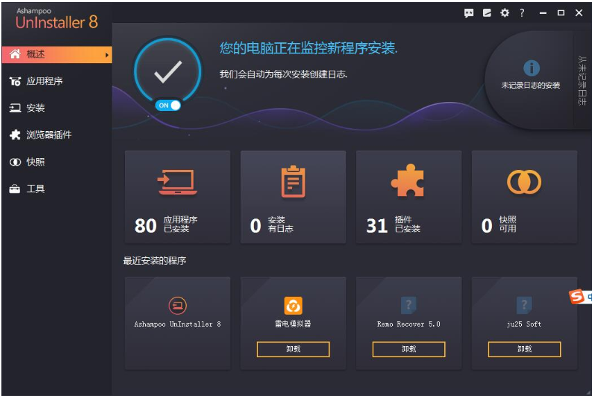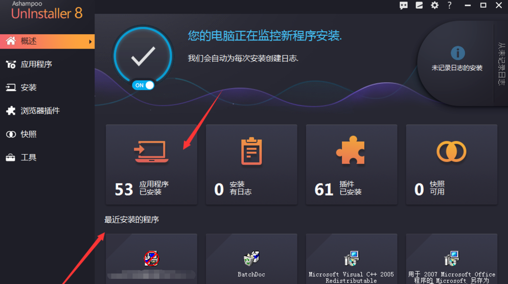 打开Ashampoo UnInstaller软件,进入主界面,弹出提示,推荐启动程序安装监控,照做即可,