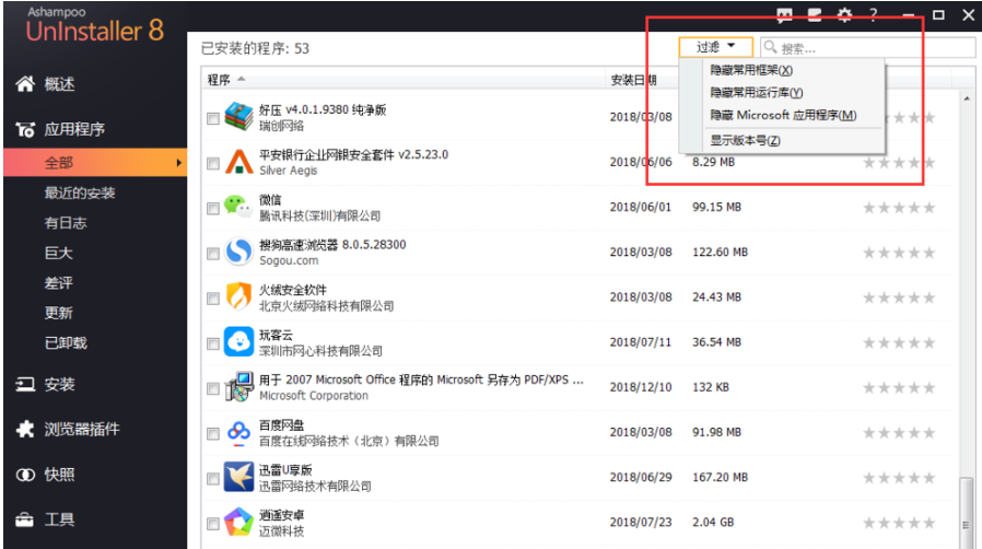 如果软件应用过多,可以点击【过滤】功能,选择【隐藏常用框架】、【隐藏常用运行库】等,便于快速查找软件,