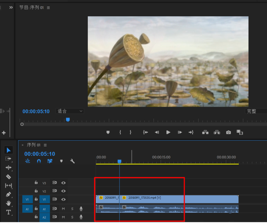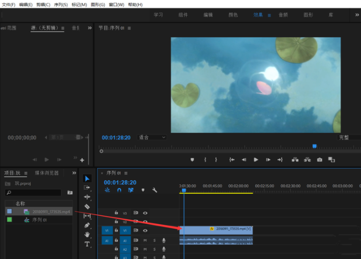 将视频文件拖动到时间轴上,如图,