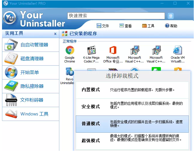 Your Uninstaller! ,这款软件虽然很多年没有更新了,但是依然好用,它可以强力卸载Windows系统中的应用程序,卸载时你可以根据情况选择四种模式,非常贴心。另外,Your Uninstaller!还附带了六个实用小工具,包括启动项管理、磁盘清理、开始菜单管理、隐私擦除、文件粉碎等,充分满足了用户需求。