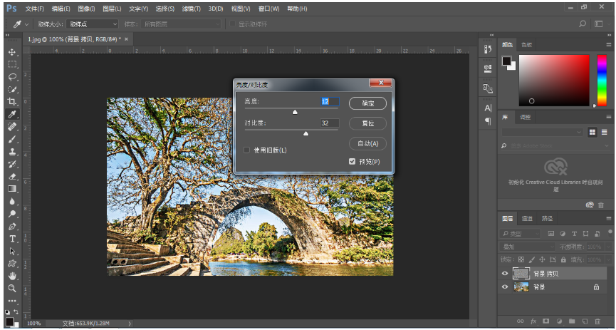 在菜单栏中点击【图像】——【调整】——【亮度/对比度】,弹出对话框,调整高度、对比度,点击确定,