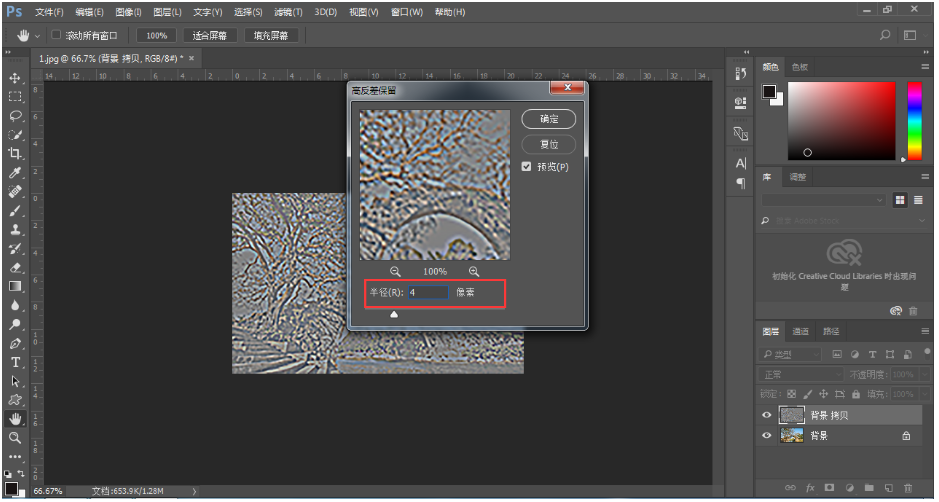 在菜单栏中点击【滤镜】——【其它】——【高反差保留】,半径数值为4,
