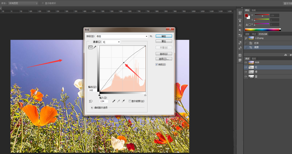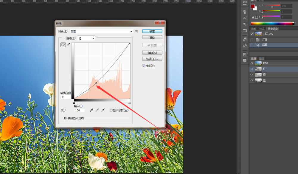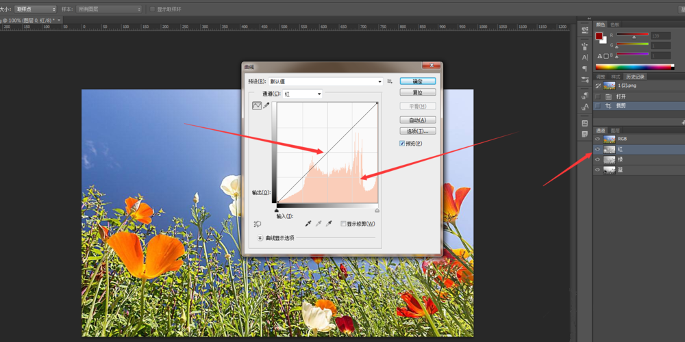 单击红色通道,按快捷键【Ctrl+M】,打开曲线窗口,上下拉动曲线,可以调整图片中红色的数量,