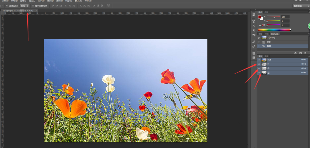 打开Photoshop软件,导入一张图片,如图,点击右侧的【通道】,对应的通道有3种,分别为红、绿、蓝通道,