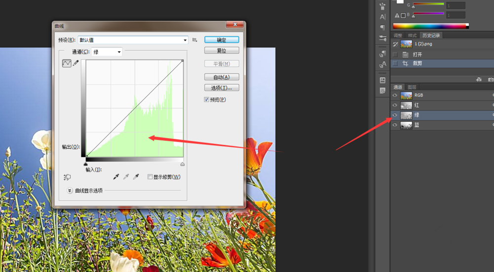 单击绿色通道,按【快捷键】Ctrl+M,打开曲线窗口,同样的方法,拉动曲线来调整图片中绿色的数量,