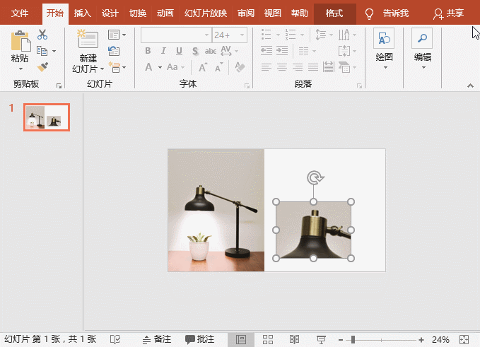 新建一个PPT文稿,添加一张幻灯片,插入一张图片,再复制一张相同图片,点击菜单栏的【格式】——【裁剪】——【纵横比】按钮,选择【1:1】选项,