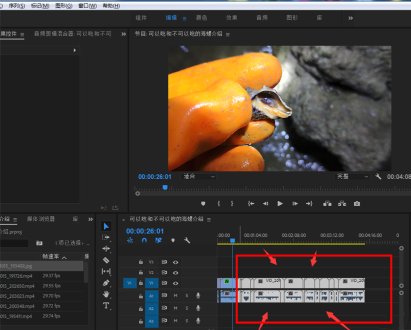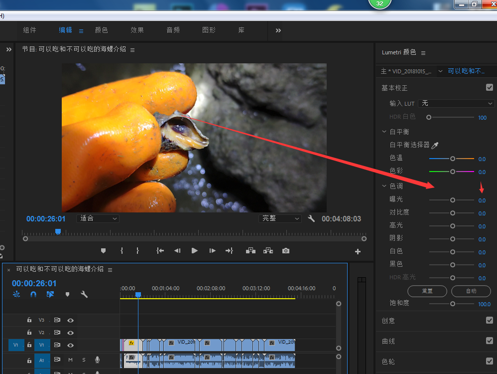 回到时间轴,选中要批量调整曝光的素材片段,看箭头指示,