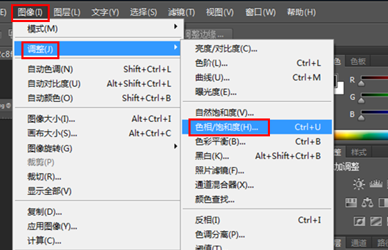 导入图片到PS软件,在菜单栏中点击【图像】——【调整】——【色相/饱和度设】,快捷键是【Ctrl——U】,
