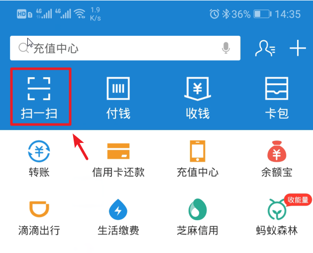 打开手机支付宝,进入主界面,点击【扫一扫】,