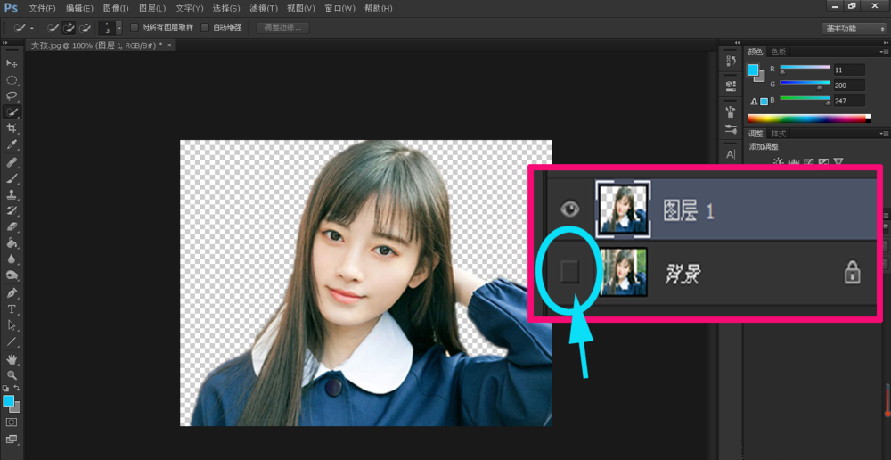 隐藏背景图层,即可得到想要抠取的人物图像,如图。