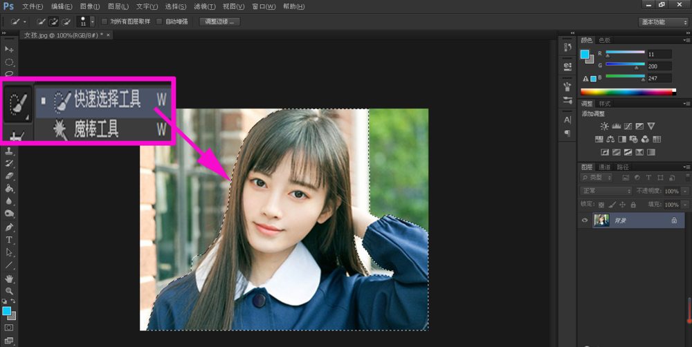打开Photoshop软件,导入一张图片素材,在左侧工具栏中点击【快速选择工具】,然后拖动鼠标来框选图片,创建选区;