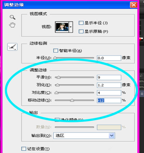 按住快捷键【Alt+Ctrl+R】,打开调整边缘对话框,根据实际情况来调整参数,如图;