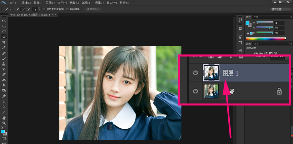按住快捷键【Ctrl+J】,复制图像,生成图层1;