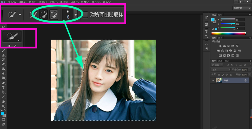 通过添加选区和减少选区的切换,以及设置画笔大小,对图像边缘进行细描;