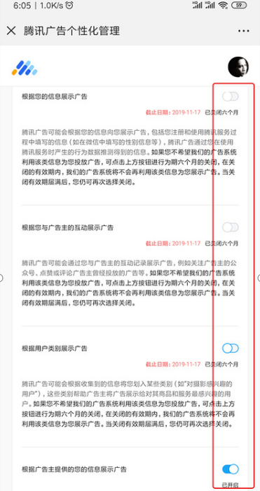 4. 接下来会出现四个可操作按钮,分别是“根据您的信息展示广告”、“根据您与广告主的互动展示广告”、“根据用户类别展示广告”、“根据广告主提供的您的信息进行展示广告”,点击关闭就可以;
