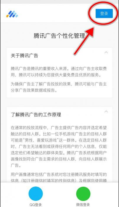 3.在弹出“腾讯广告个性化管理”页面中,点击“登录”按钮。这里建议选择QQ登录,