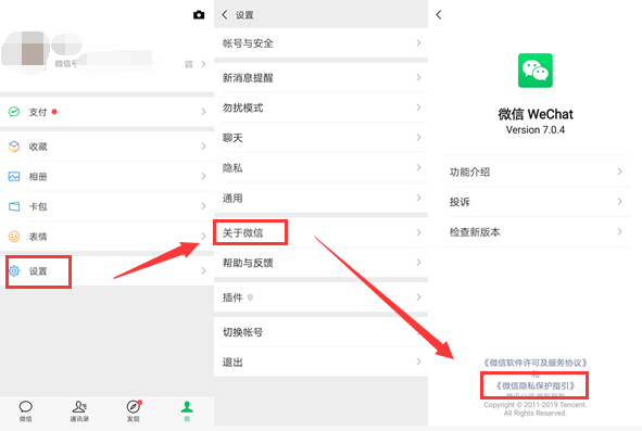 1.点击“我”→“设置”→“关于微信”,进入微信版本号页面;