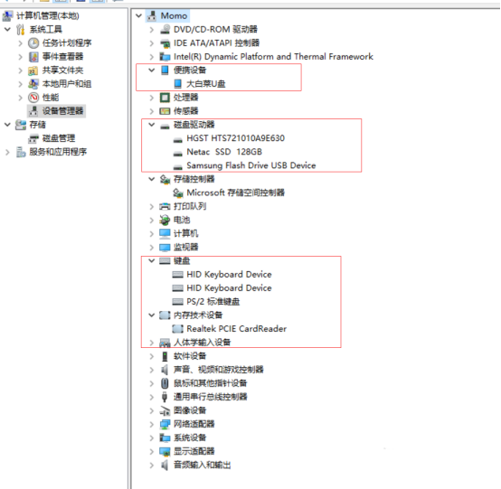 依次点击右侧的各种驱动器、控制器、设备,查找是否有之前记住的那个名字,着重查找便携设备、磁盘驱动器、存储控制器、键盘等,有可能你的U盘被识别成了其他设备;