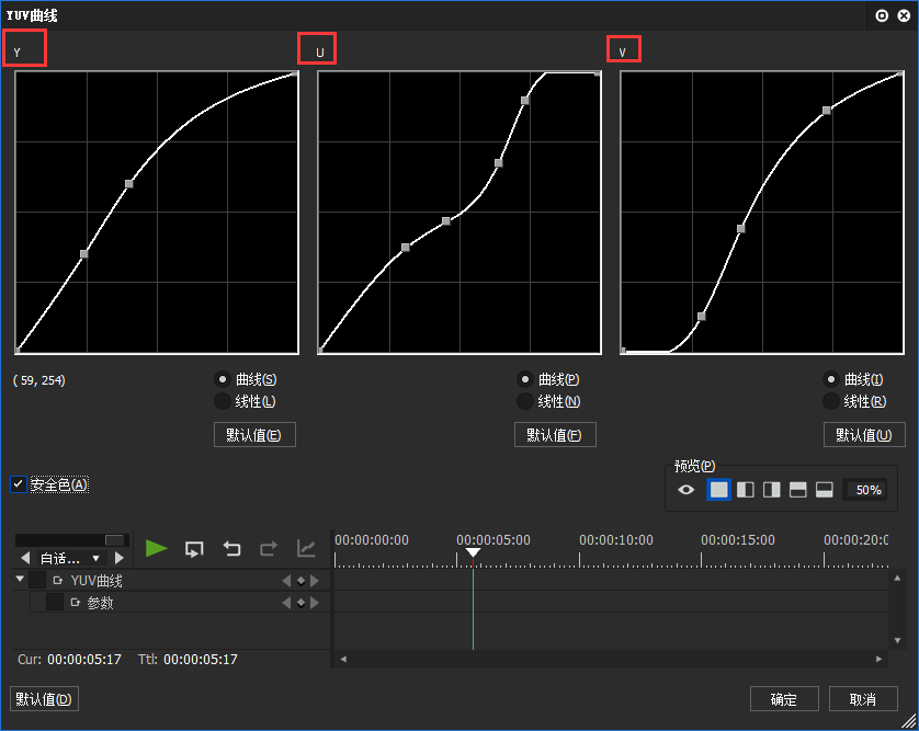双击YUV曲线,进入调整页面,如图,我们可以调整视频亮度与颜色;由于UV两个曲线不易调整,小编不推荐使用,