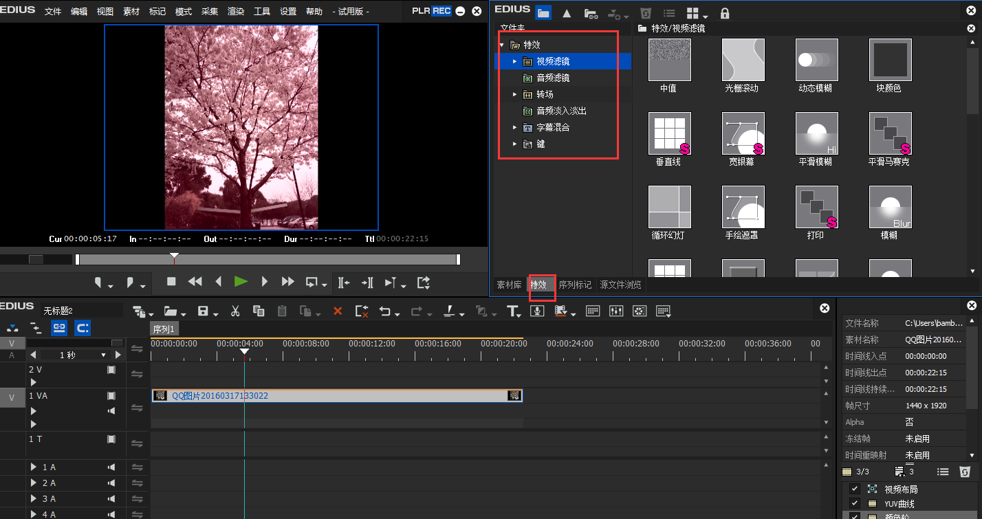 打开EDIUS软件,进入界面,在素材库窗口点击展开【特效】一栏,如图,