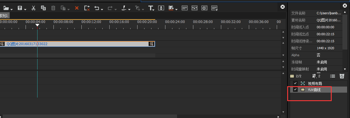 选择YUV曲线,将其拖拽放置到时间轴上的素材中,在右边信息窗口即可显示YUV曲线,如图,