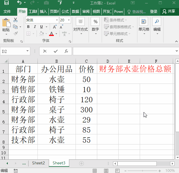 单纯统计特定能够满足两个及以上条件的单元格内容进行求和。输入公式【=SUMIFS(C2:C8,A2:A8,\"财务部\",B2:B8,\"水壶\")】即可。