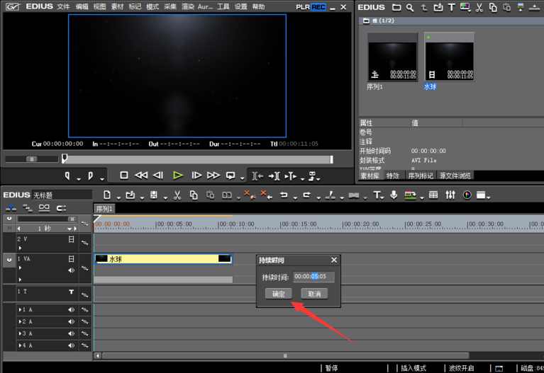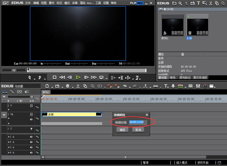 这时会弹出持续时间设置窗口,当前视频的播放速度所需要的时长为11秒5帧,
