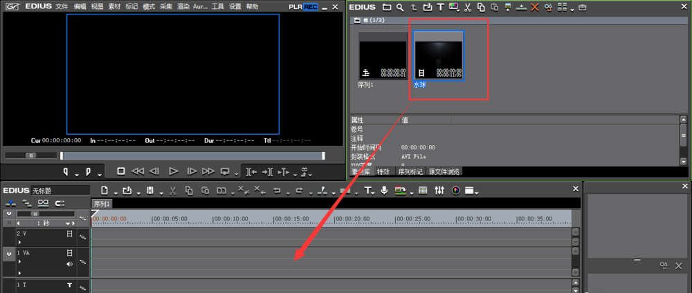 将视频文件拖拽到箭头所指的视频轨道,如图,