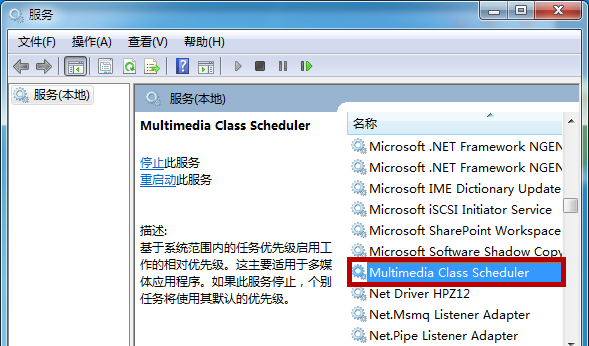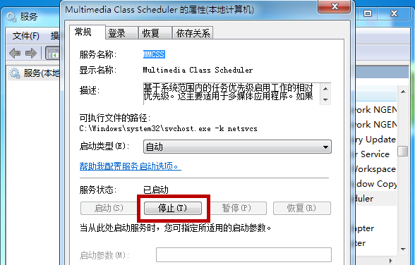 打开Multimedia Class Scheduler服务的属性界面,点击【停止】功能,关闭,然后重启计算机。