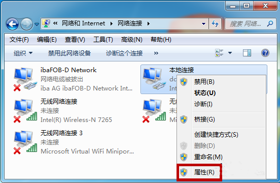 接着进入网络连接界面,鼠标右击【本地连接】,弹出菜单,找到【属性】选项并点击,