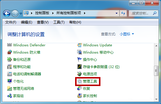 点击开始菜单,然后点击打开控制面板,如图,选择【管理工具】,