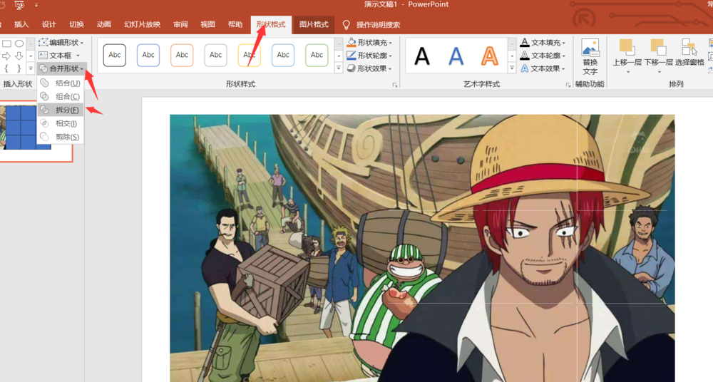 然后选中下方的图片,再选中九个形状,在菜单栏中点击【形状格式】——【合并形状】——【拆分】,