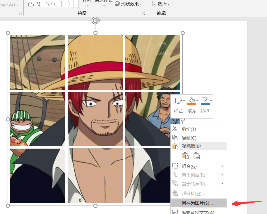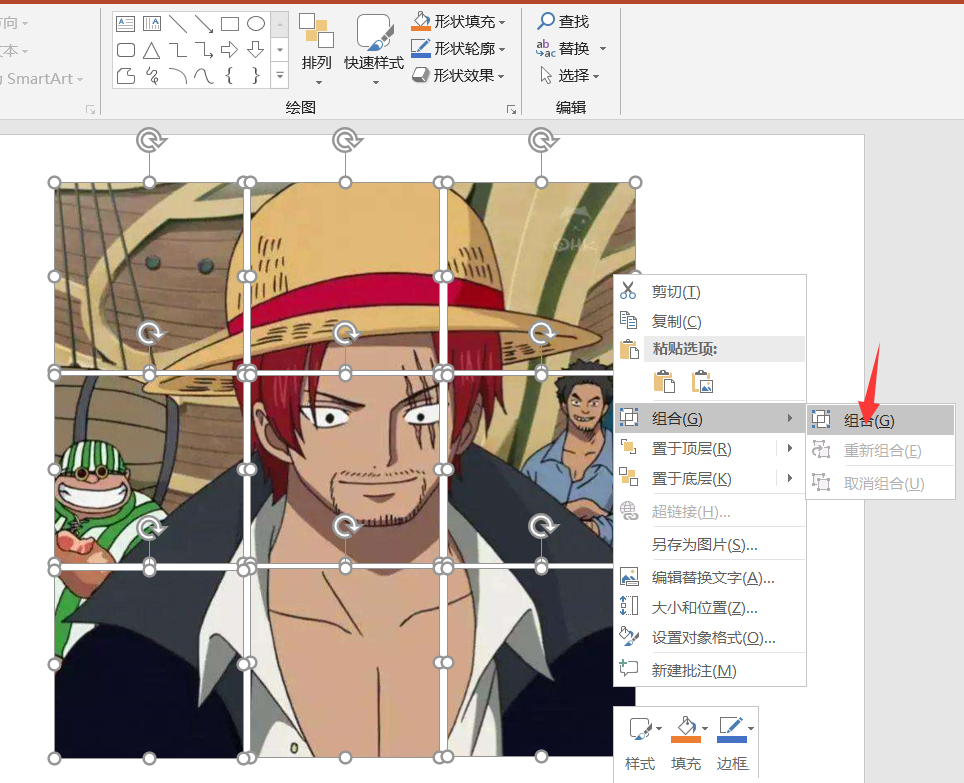 删除完成,我们可以看到图片就只剩下九宫格了,选中所有的小图片,点击【组合】——【组合】,