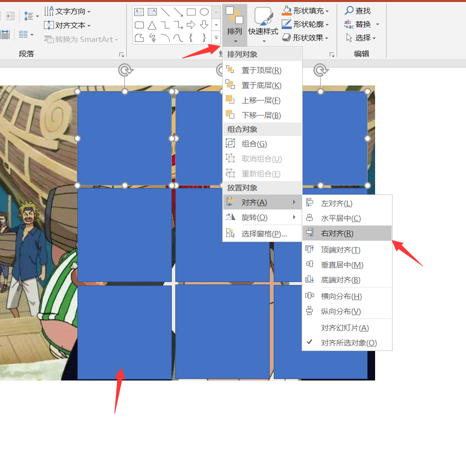选中九个形状,然后选择排列,选择对齐方式为右对齐,左对齐和垂直对齐,调整正方形的大小和位置,