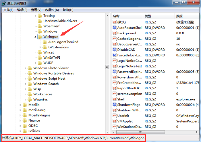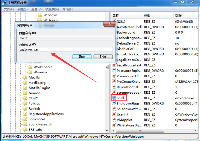 2、然后在Winlogon文件夹中找到Shell,双击Shell,弹出编辑字符串窗口,修改数值数据为exolorer.exe,然后点击确定。