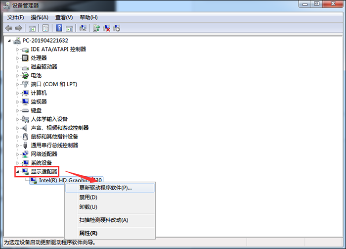 2、进入设置管理器界面,点击【显示适配器】,接着将光标移动到电脑适配器上,鼠标右击,点击【更新驱动程序软件】即可。