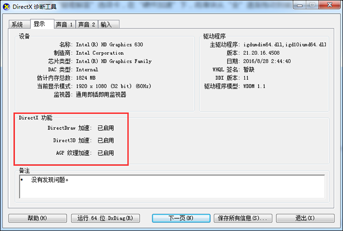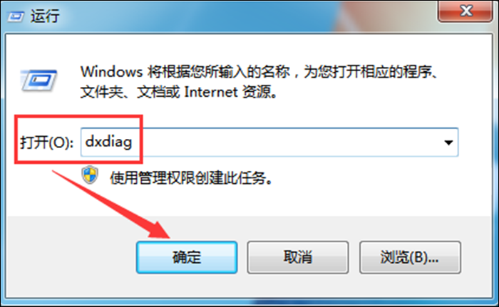 1、按快捷键【Win+R】,打开运行窗口,输入dxdiag,点击确定,进入DirectX诊断工具界面,