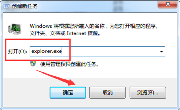 2、打开创建新任务窗口,输入explorer.exe,然后点击确定,即可解决电脑黑屏现象。
