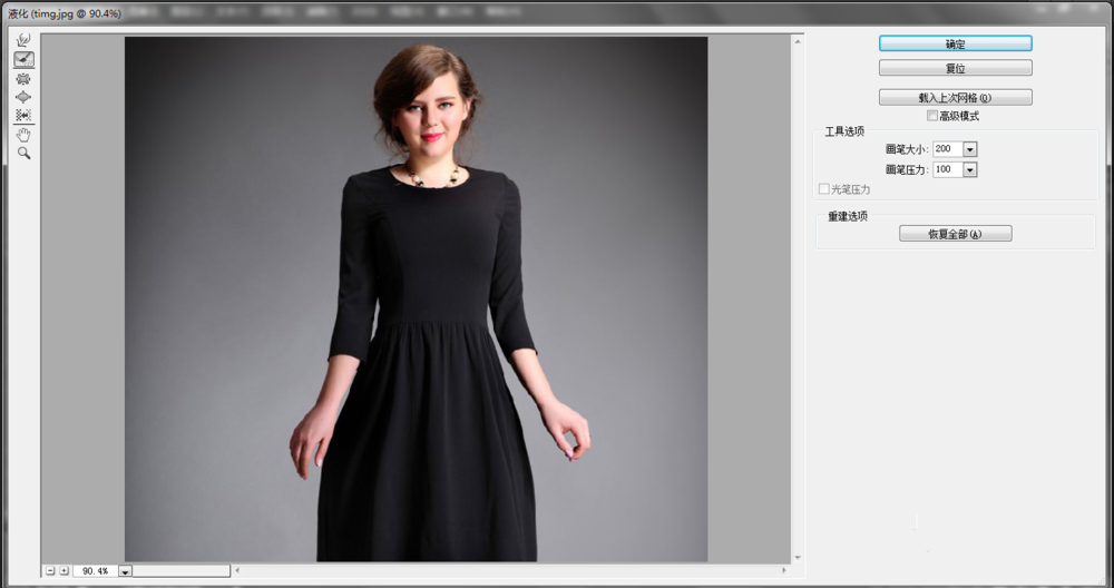 缩小图像,使用褶皱工具在腰身处进行单击,进行调整,