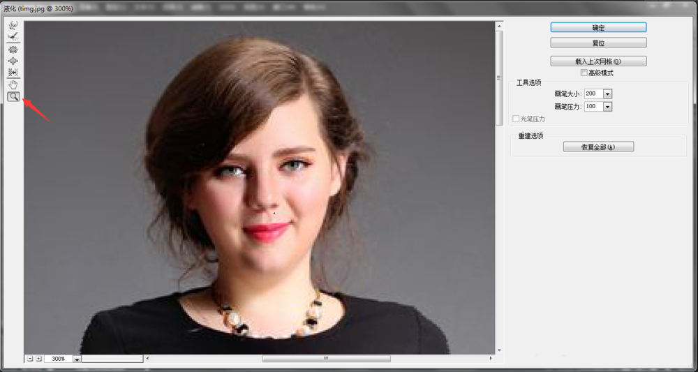 弹出液化窗口,使用向前变形工具,调整画笔大小(画笔适当大一些),在人物腰身的两边分别单击,然后向中间拖动,如图,