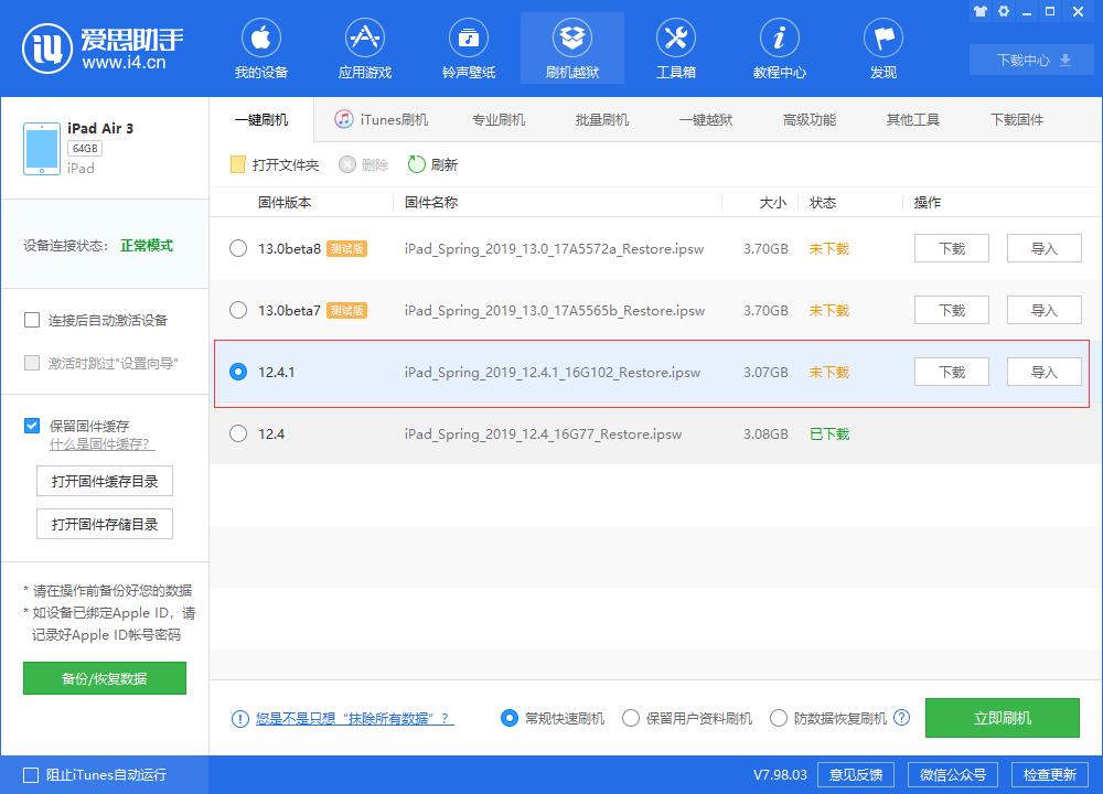 在可刷版本中选择要刷的iOS版本,点击【立即刷机】,爱思助手会自动下载固件并刷机;如果你已经下载固件,可以点击【导入】,再点【立即刷机】,