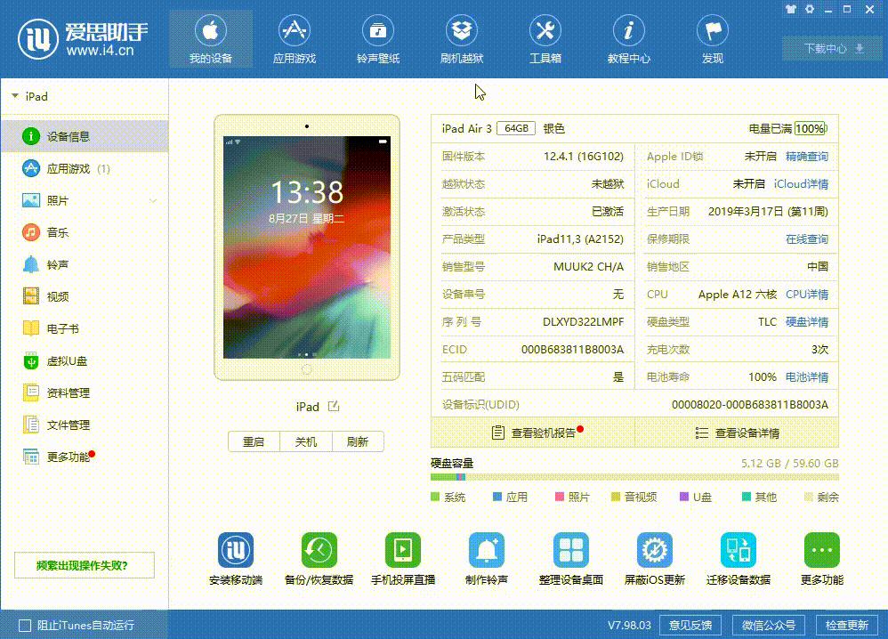 使用数据线连接iPhone和电脑,打开最新版爱思助手,点击【刷机越狱】,进入一键刷机界面,连接成功会自动匹配固件,