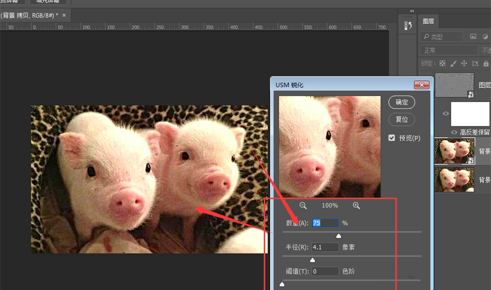 打开USM锐化属性窗口,适当调整数值,直接能看到图片效果,