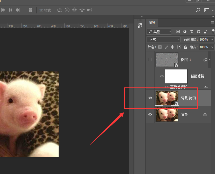 打开Photoshop软件,导入一张图片素材,然后复制一个图层,并且右键转为智能化对象,