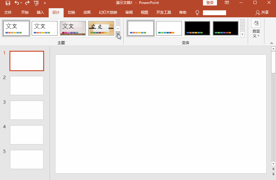 打开PPT文稿,在菜单栏中点击【设计】——【主题】栏右下角,给幻灯片设置一个主题;然后点击【设计】——【变体】栏,选择一个主题颜色。