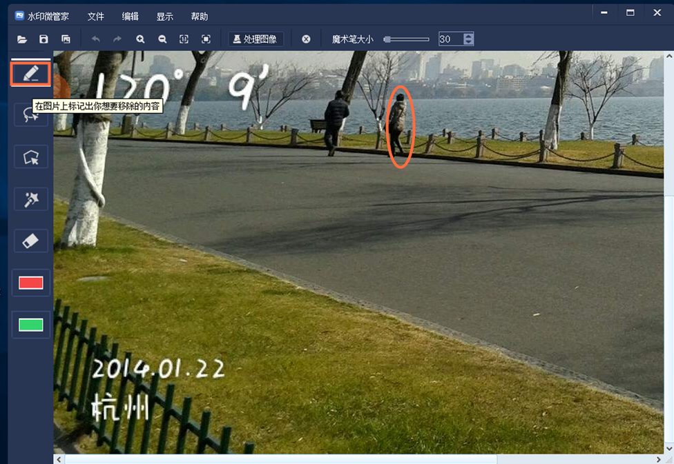 如图,我们需要将图片中的这个路人抹除,先选择左侧的第一个工具,