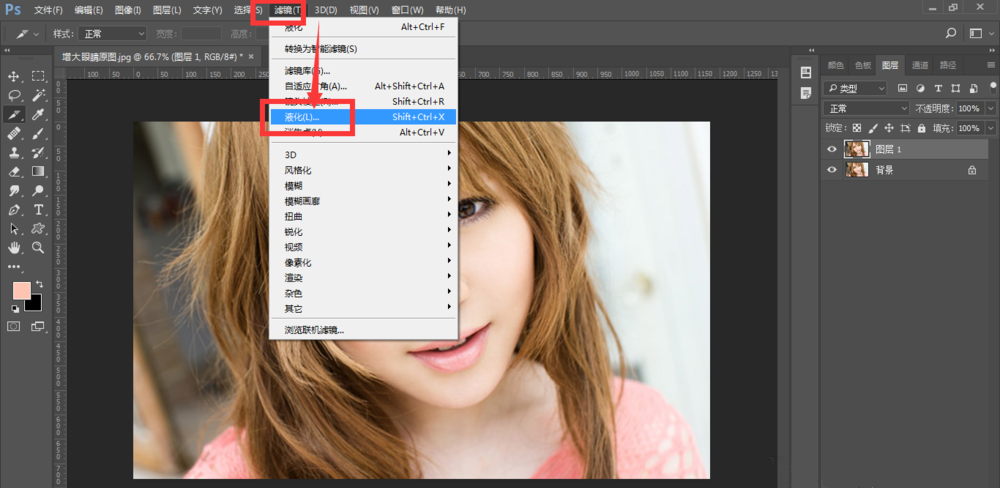 在菜单栏中点击【滤镜】——【液化】选项,如图,