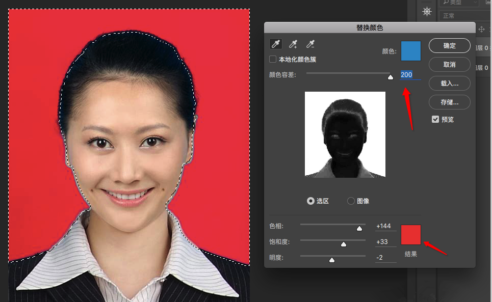 然后点击【图像】——【调整】——【替换颜色】,弹出窗口,结果色选红色,如果边缘区带蓝色,可以拉大容差,直到人物边缘蓝色全部替换成红色,