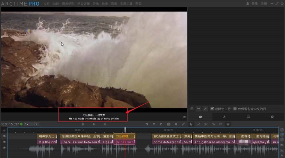 导入成功,回到软件主界面,右边就是双语文本,下方就是视频中的音频波形,