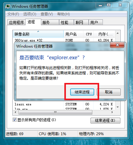 出现对话框,点击【结束进程】,即可关闭explorer.exe程序,
